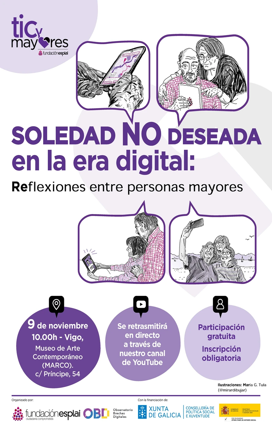 El 9 de noviembre de 2023, en el Museo de Arte Contemporáneo (MARCO) de Vigo, presentamos los resultados de un estudio encargado por Fundación Esplai – Ciudadanía Comprometida, sobre las TIC y la soledad no deseada entre las personas mayores. Mediante grupos de discusión, exploramos las posibilidades y limitaciones de las nuevas tecnologías para abordar este fenómeno y formulamos algunas recomendaciones sobre la formación y el apoyo necesarios. En breve compartiremos el informe final del estudio.